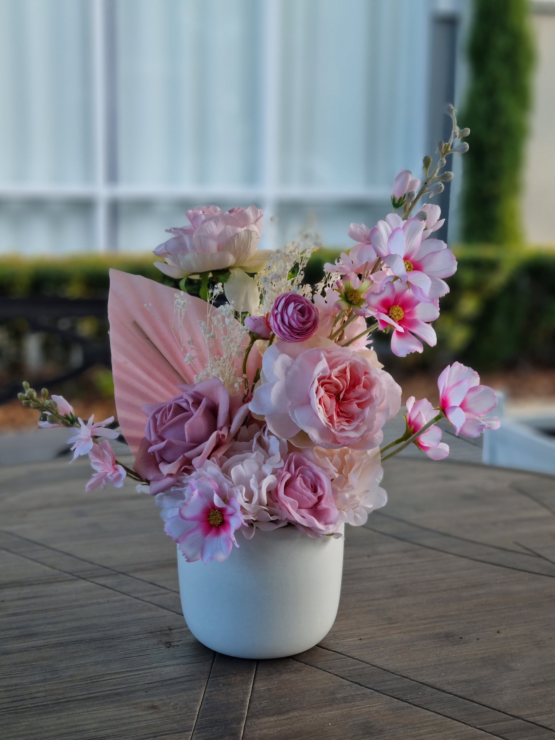 Wild Blooms premade Flower arrangement in pink colour. Featuring both artificial and dried flowers in a white pot. Perfect for a gift or an office space. No care needed just to be kept out of direct sunlight and away from moisture.