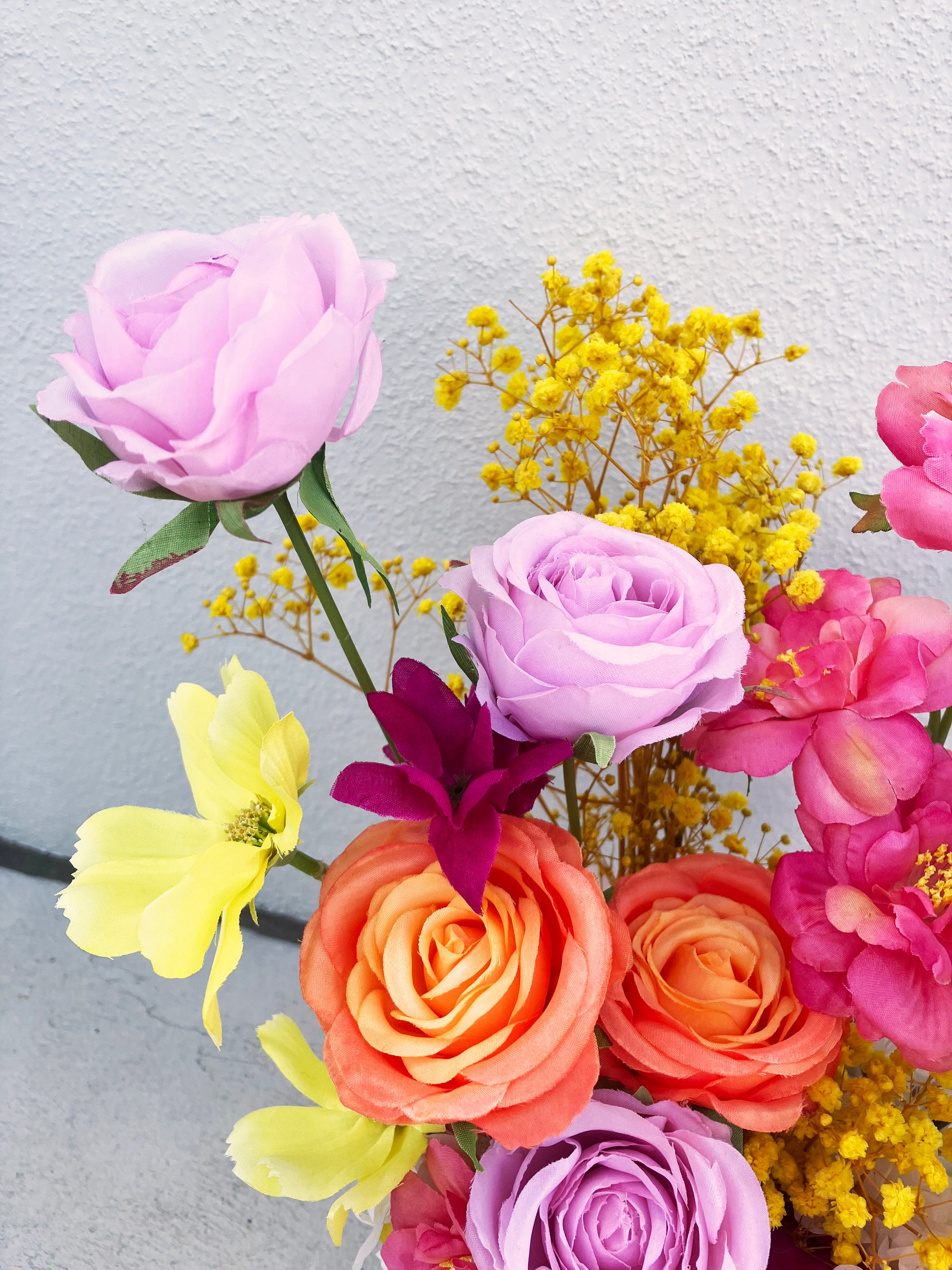 Wild Blooms premade Flower arrangement in pink colour. Featuring both artificial and dried flowers in a white pot. Perfect for a gift or an office space. No care needed just to be kept out of direct sunlight and away from moisture.